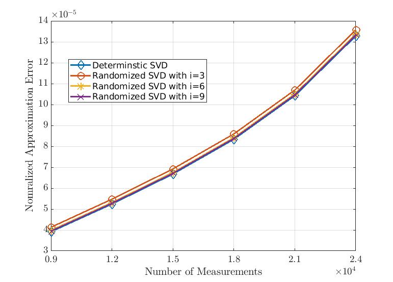 In this plot, we can see how good randomized SVD can approximate our data matrix with increasing number of measurements (or features) for a given number of data points. Here, we fix the number of data points as 3000 and vary the number of measurements from 9000 to 24000. We also set the target rank as 10% of number of measurements. Moreover, in this example, is the number of power iteration. It is evident, the randomized SVD can almost attain the low-rank approximation performance of conventional deterministic SVD.